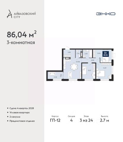 Продается 2-комн. квартира в ЖК "Айвазовский City" на 4 этаже. Квартира без отделки, полностью готова к чистовой отделке и дальнейшему ремонту. Общая площадь: 63.58 кв.м., жилая: 26.79 кв.м., площадь просторной кухни-столовой: 16.67 кв.м. Угловая квартира, идеально подойдет любителям тишины и панорамных видов. В квартире одна лоджия, два совмещенных санузла. Высота потолков 2.72 м.