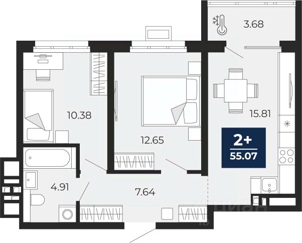 2 комнаты. Одна комната проходная — классическая планировка для тех, кто ищет раздельное проживание или сдачу. Есть вместительный балкон, при желании можно остеклить и сделать дополнительное место для отдыха. Площадь квартиры позволяет разгуляться дизайнеру.