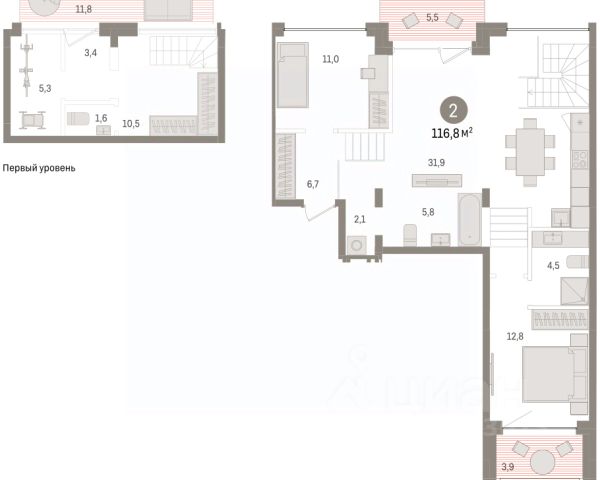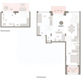 Двухуровневая квартира с кухней-гостиной и двумя спальнями в Доме у озера. Особенности планировки: балкон, вид во двор, второй санузел, гардеробная, двухуровневая, лоджия, мастер-спальня, окно в коридоре, потолки 3 м и выше, предчистовая отделка, разнесённые спальни, терраса на крыше, тёплая лоджия.