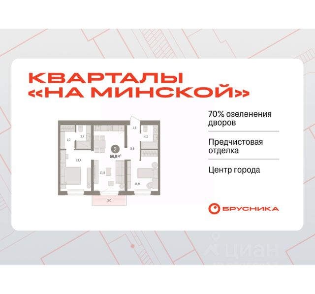 Квартира в счёт первоначального взноса по программе обмена. Информация по телефону, мы вам все подробно расскажем! Просторная двухкомнатная квартира с предчистовой отделкой в Кварталы "На Минской" на 3 этаже. Общая площадь: 65.09 кв.м., жилая: 23 кв.м., площадь просторной кухни-гостиной: 21.3 кв.м. Комнаты изолированные, все окна выходят на одну сторону. В квартире одна лоджия, два совмещенных санузла. Высота потолков 2.7 м. Дом монолитный, многоподъездный, переменной этажности, от 7 до 11 этажей. Квартира находится во 2-й секции высотой 7 этажей в корпусе 2. На этаже 7 квартир. В подъезде 1 пассажирский и 1 грузовой лифт. Окончание строительства - 1 квартал 2027 года. Оформление сделки по договору долевого участия. Квартира с кухней-гостиной и двумя спальнями в кварталах "На Минской". Особенности планировки: гардеробная, вид во двор, разнесённые спальни, предчистовая отделка, мастер-спальня, балкон. квартиры в нашей базе: МНС02-Ж2.3.2. В сердце города Кварталы "На Минской" находятся в самом центре. За десять минут можно дойти до площади 400-летия Тюмени и Большого Драматического театра, Тюменского индустриального и медицинского университетов, спортивного комплекса "Строймаш", ТРЦ "Гудвин" и "Премьер", Тюменского технопарка. Поблизости много детских садов, школ и поликлиник. Пространство разного опыта Создавая кварталы "На Минской" мы вдохновлялись Хакскими дворами в Берлине и улицей Давида Агмашенебели в Тбилиси. И первые и вторая — яркие разнообразные пространства, сформированные прогрессивными архитекторами и притягивающие городских интеллектуалов. Престижная недвижимость здесь соседствует с барами, ресторанами, креативными кластерами и бюро, дизайнерскими лавками. Полезные улицы Кварталы "На Минской" свяжет сеть променадов, автомобильных проездов и велодорожек. Уличный фронт проекта мы сформируем с помощью аллейной посадки деревьев. Они создадут тень для ресторанов и кафе на первых этажах, визуально отделят проезжую и пешеходную части, снизят объём пыли и уровень шума. Мы реализуем проект в районе с развитой базовой инфраструктурой. И поэтому тщательно подошли к программированию коммерции, посчитав, что её основная задача — "закрывать" более высокие потребности жителей. Здесь может появиться пекарня с вкусными круассанами, турагентство на случай, если захочется перезимовать в Сочи, массажный кабинет, ресторан, когда надоело есть дома и многое другое. #zsFF6m 2-комнатная квартира с двумя санузлами в Тюмени.