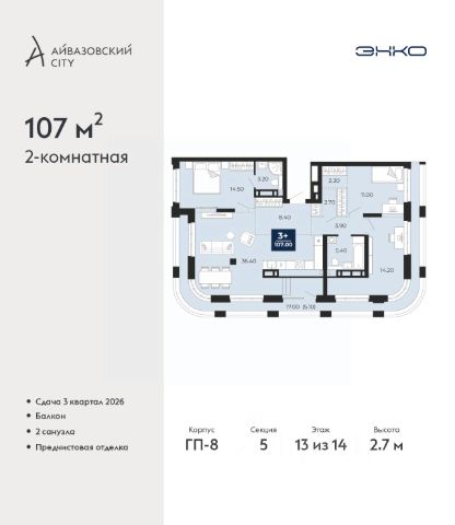Продается 2-комн. квартира с предчистовой отделкой в ЖК "Айвазовский City" на 13 этаже. Общая площадь: 107 кв.м., жилая: 28.7 кв.м., площадь просторной кухни-столовой: 36.4 кв.м. Квартира без проходных комнат, окна выходят нa три cтopoны дома. В квартире один балкон, два совмещенных санузла. Терраса представляет собой роскошную зону отдыха для проведение вечеров в кругу семьи и друзей или организация вечеринок. Высота потолков 2.7 м.