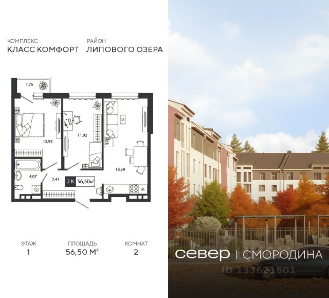 Продаётся квартира площадью 53.75 м2 в жилом комплексе "Смородина". Квартира находится на 1 этаже, жилая площадь квартиры 22.40 м2, площадь просторной кухни — 16.71 м2. Среди особенностей планировки — изолированные комнаты с окнами на одну сторону, 1 совмещённый санузел. Срок сдачи — IV кв. 2026 Жилой комплекс "Смородина" — это: - уютный малоэтажный комплекс в районе ММС - дома высотой 4 этажа - квартиры от студий до семейных вариантов с отапливаемыми лоджиями - экологичные материалы в благоустройстве территории Окружение В 5 минутах ходьбы от проекта — озеро Липовое с песчаным пляжем и лесопарковая зона. Инфраструктура В шаговой доступности есть все для комфортной жизни: школы, детские сады, магазины и аптеки. Рядом с проектом — остановка общественного транспорта. Благоустройство Прямо во дворе — собственные грядки для жителей, где можно выращивать зелень и цветы. Для детей оборудованы детские площадки из натуральных материалов. Лобби Вдохновленные современными тенденциями наши парадные разработаны с акцентом на эстетическую привлекательность и практичность. Использование натуральных материалов и ярких цветовых акцентов создает атмосферу уюта и стиля. Планировки Среди многообразия продуманных планировок есть и уютные студии, и просторные семейные варианты. Во всех квартирах предусмотрены отапливаемые лоджии, где можно устроить зону отдыха или рабочий кабинет.