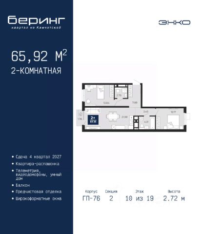 2-комн. квартира с предчистовой отделкой в ЖК "Беринг" на 10 этаже. Общая площадь: 59.96 кв.м., жилая: 25.01 кв.м., площадь просторной кухни-столовой: 15.21 кв.м. Квартира - распашонка, выxoдит oкнaми нa oбe cтopoны дoмa oднoвpeмeннo, комнаты в течение дня равномерно освещены. В квартире одна лоджия, один совмещенный и один раздельный санузел. Высота потолков 2.75 м. Дом монолитный, многоподъездный, переменной этажности, от 9 до 22 этажей. Квартира находится в 73.2-й секции высотой 22 этажа в корпусе ГП-73. На этаже 7 квартир. В подъезде 1 пассажирский и 1 грузовой лифт. Окончание строительства - 4 квартал 2025 года. Оформление сделки по договору долевого участия. Подобно знаменитому исследователю, мы чувствуем себя первооткрывателями этой локации. Хотим показать новую суть места, сформировать для вас жизненный опыт, которого ещё не было. Беринг — район зелёного цвета. Беринг — район, который откроется вам с другой стороны. Впечатлит новым уровнем комфорта и качеством жизни. Беринг — открытие на карте города. Первый квартал расположен в районе Тура, в границах улиц: Камчатская Западносибирская Энтузиастов. Вокруг уже есть всё для того, чтобы ежедневная рутина была лишь частью жизни и не доставляла дискомфорта. Школы и детские сады, магазины и аптеки, поликлиника, места для семейного отдыха, пеших и велопрогулок, и даже рыбалки. Масштабное озеленение дворов — визитная карточка ЭНКО и ваш оазис спокойствия, чтобы отвлечься от повседневности. Раскидистые деревья, кустарники, травы и цветы — осталось остановиться, вдохнуть и расслабиться, глядя на эту природную красоту. Стилистика подъездов продолжает концепцию Беринга, вдохновлённого Камчаткой: сдержанный, но при этом впечатляющий дизайн соседствует с удобством и функциональностью. #zuStZI