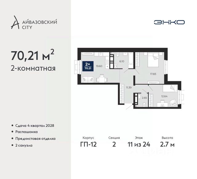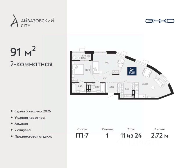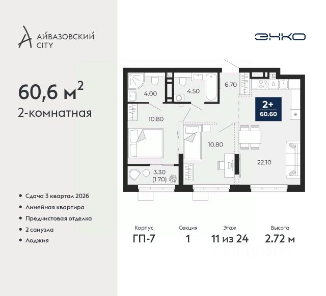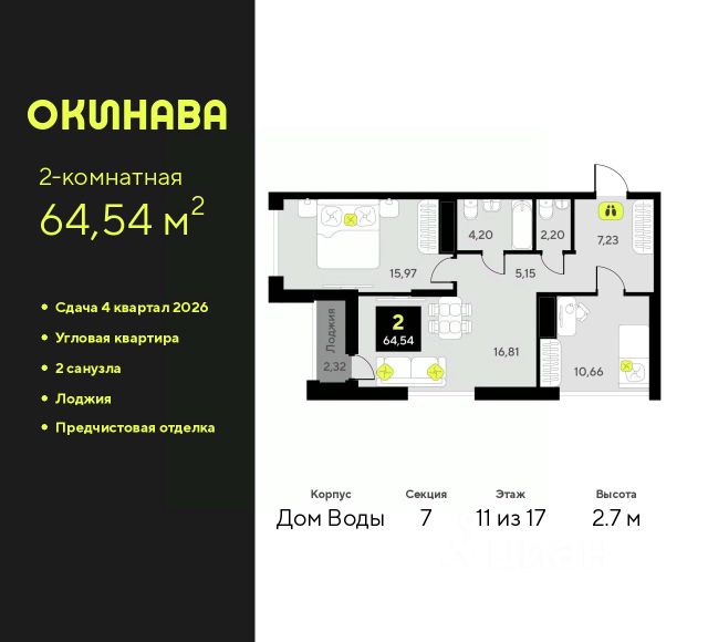 Продается двухкомнатная квартира от застройщика с предчистовой отделкой в ЖК "Окинава" на 11 этаже. Общая площадь: 76.77 кв.м., жилая: 34.2 кв.м., площадь просторной кухни-столовой: 22 кв.м. Квартира - распашонка, без проходных комнат, окна выходят на paзные стороны дома. В квартире одна лоджия, два совмещенных санузла. Высота потолков 2.7 м.