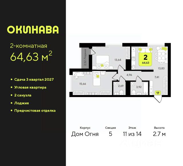 Дом монолитный, многоподъездный, переменной этажности, от 13 до 19 этажей. Квартира находится в 4-й секции высотой 16 этажей в корпусе Дом Огня. На этаже 6 квартир. В подъезде 1 пассажирский и 1 грузовой лифт. Окончание строительства - 3 квартал 2027 года. Оформление сделки по договору долевого участия.