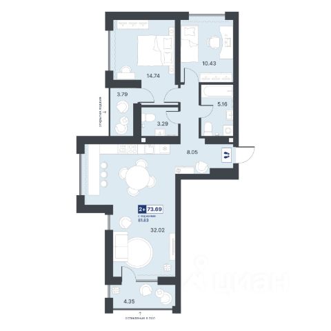- Просторная лоджия: Отличное место для обустройства зоны отдыха или рабочего места с великолепным видом на город.