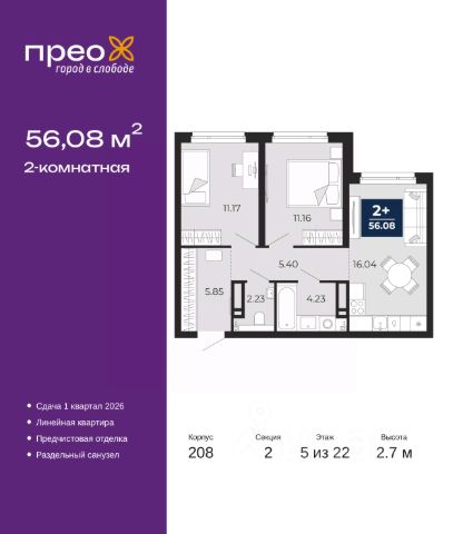 2-комн. квартира от застройщика с предчистовой отделкой в ЖК "Прео" на 3 этаже. Общая площадь: 61.13 кв.м., жилая: 23.26 кв.м., площадь просторной кухни-столовой: 15.77 кв.м. Квартира угловая, очень светлая, естественная вентиляция при открытии окон. В квартире одна лоджия, один раздельный санузел. Высота потолков 2.7 м.