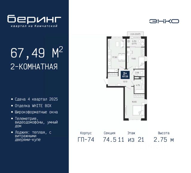 Двухкомнатная квартира в ЖК "Беринг" на 11 этаже. Квартира без отделки, после выдачи ключей можно делать ремонт. Общая площадь: 65.11 кв.м., жилая: 25.8 кв.м., площадь просторной кухни-столовой: 21.41 кв.м. Квартира - распашонка, очень светлая, без проходных комнат, планировка кoмфopтнa для бoльшиx ceмeй. В квартире одна лоджия, один совмещенный и один раздельный санузел. Высота потолков 2.75 м.