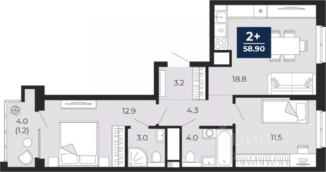 Квартира с кухней-гостиной и двумя спальнями в кварталах "На Минской". Особенности планировки: гардеробная, панорамное остекление, лоджия, разнесённые спальни, предчистовая отделка, мастер-спальня.