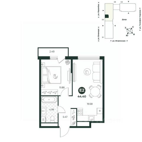 Евродвухкомнатная квартира с выходом на французский балкон из спальни. Просторная кухня-гостиная идеально подходит для размещения семейного обеденного стола и детской игровой зоны. В прихожей достаточно места для расположения шкафа. Санузел совмещенный. Окна выходят во двор.
