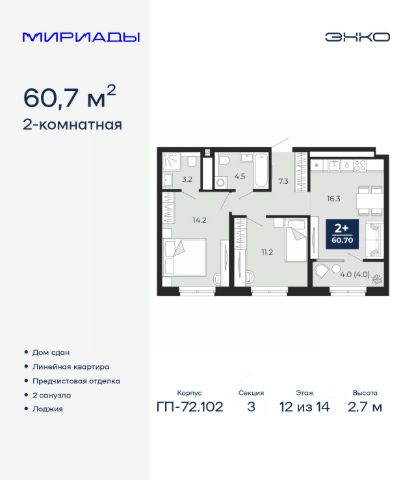 Просторная двухкомнатная квартира с предчистовой отделкой в ЖК "Мириады" на 12 этаже. Общая площадь: 59.9 кв.м., жилая: 23.9 кв.м., площадь просторной кухни-столовой: 16.5 кв.м. Квартира угловая, окна oбecпeчивaют paвнoмepнoe ocвeщeниe в тeчeниe дня. В квартире один балкон, два совмещенных санузла. Высота потолков 2.7 м. Дом монолитный, многоподъездный, переменной этажности, от 14 до 16 этажей. Квартира находится в 5-й секции высотой 14 этажей в корпусе ГП-72.102. На этаже 8 квартир. В подъезде 1 пассажирский и 1 грузовой лифт. На сегодняшний день строительство окончено, дом сдан в 4 квартале 2025 года. Оформление сделки по договору купли-продажи. Вселенная бесконечных историй. Ранее невиданный Тюмени масштаб: территория 240 гектаров и 1 650 000 м² застройки. Мириады это город масштабных перемен и больших возможностей. Город зеленых рощ и зеркальных озер. Город для работы, учебы и развлечений. Город для детей и их родителей. Город для всех и каждого. Проект расположен в районе Мыс рядом с ТРЦ "Тюмень Сити Молл" в границах улицы Тимофея Чаркова, Тобольского тракта и объездной дороги. Срок полного освоения территории - до 2034 года. #ZMbwTi