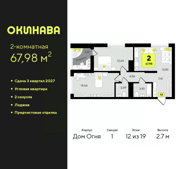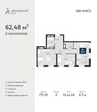 2-комн. квартира с предчистовой отделкой в ЖК "Айвазовский City" на 12 этаже. Общая площадь: 62.48 кв.м., жилая: 24.29 кв.м., площадь просторной кухни-столовой: 16.28 кв.м. Квартира угловая, очень светлая, естественная вентиляция при открытии окон. В квартире одна лоджия, один совмещенный и один раздельный санузел. Высота потолков 2.7 м. Дом монолитный, многоподъездный, высотой 24 этажа. Квартира находится во 2-й секции в корпусе ГП-13. На этаже 6 квартир. В подъезде 1 пассажирский и 1 грузовой лифт. Окончание строительства - 4 квартал 2027 года. Оформление сделки по договору долевого участия. Новый жилой район располагается в живописном месте на берегу Туры в центральной части города. Принципиально новое пространство для жизни в центре современного города для тех, чьи мечты сбываются, кто нацелен на постоянный рост, перемены к лучшему для себя и своих близких. Каждая деталь Айвазовский City вдохновляет и заряжает на новые свершения: авторская архитектура, сбалансированная продуманная инфраструктура, дизайнерские дворы со спортивными и детскими площадками, парковые зоны с фонтанами, водный канал, украшающий центральный прогулочный маршрут района и многое другое. В 2019 года проект стал лауреатом престижной премии Urban Awards 2019 в номинации "Лучший строящийся региональный жилой комплекс бизнес-класса". Главная особенность Айвазовский City - соседство разных архитектурных школ в рамках одного дома. Изысканная классика, выразительная эклектика и оригинальный модерн - жить в одном из таких домов настоящий повод для гордости. Айвазовский City это идеальное сочетание комфорта, технологий и развитой инфраструктуры. Вход в подъезд возможен с улицы и со двора. Отправляясь на работу или за покупками, жители могут выйти с внешней стороны дома, а для прогулки с ребенком со стороны двора. Экологически чистые материалы и энергосберегающие технологии, качественное освещение общественных зон, видеонаблюдение по всей территории жилого района (в том числе в подъездах, лифтах и в подземном паркинге), закрытые дворы с доступом только для жителей Айвазовский City. Часть домов в Айвазовский City будут оснащены подземным паркингом. Востребованный в нашем климатическом поясе формат хранения автомобилей защитит собственность владельца в любое время года. Аккредитация в банках: ПАО "Газпромбанк", ПАО Банк "ВТБ", ОАО "Альфа-Банк", "Сбербанк России", АО "ДОМ.РФ" и других. #Z6b436