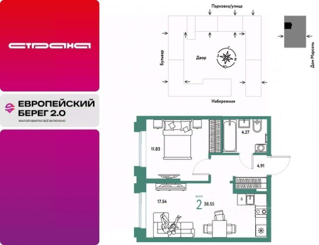 Объявление от застройщика Страна Девелопмент. Покупка квартиры защищена банком. Продается 2комнатная квартира на 12 этаже от застройщика Страна Девелопмент. Площадь квартиры 39,11 кв. м. О ПРOЕКТЕ Европейский берег 2.0. — это продолжение легендарного жилого комплекса Европейский берег. Он включает все, что нужно для жизни, и даже больше. Этот квартал для тех, кто не готов тратить время на ненужное, жертвовать одним ради другого. Для тех, кто хочет получить все и сразу. Именно поэтому генеральная идея проекта — жилой квартал все включено. Все преимущества включены. Никаких исключений. ПРЕИМУЩЕСТВА Разнообразие планировок: от классических до квартир с мастер-спальней и террасами. Подземный паркинг с кладовыми, охраной и видеонаблюдением 24/7. Ремонт от застройщика: 5 вариантов на выбор. Закрытый двор с площадками и зонами отдыха: мост-акведук, тренажёры, лабиринты, гамаки и шезлонги. ОТДЕЛКА Базовая отделка или готовый ремонт от застройщика. В базовой отделке все черновые работы выполнены, подведены коммуникации, стены оштукатурены под маяк. В ремонт от застройщика входит 5 вариантов отделки, уже включено всё необходимое: от сантехники до кондиционера. СПОСОБЫ ПОКУПКИ Сотрудники "Страны Девелопмент" будут сопровождать вас на каждом этапе сделки, помогут получить одобрение по ипотеке или снизить ежемесячный платеж. - ипотека - материнский капитал - 100% оплата наличными - рассрочка - обмен — это выкуп вашей старой квартиры и зачисление полученных денежных средств в счет стоимости новой квартиры или в качестве первоначального взноса по ипотеке.