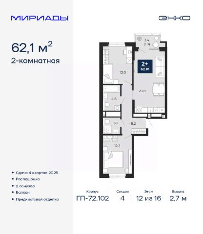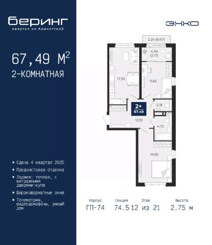 2-комн. квартира с предчистовой отделкой в ЖК "Беринг" на 12 этаже. Общая площадь: 58.49 кв.м., жилая: 21.58 кв.м., площадь просторной кухни-столовой: 16.21 кв.м. Комнаты изолированные, все окна выходят на одну сторону. В квартире один балкон и одна лоджия, один совмещенный и один раздельный санузел. Высота потолков 2.75 м. Дом монолитный, многоподъездный, переменной этажности, от 9 до 22 этажей. Квартира находится в 73.4-й секции высотой 12 этажей в корпусе ГП-73. На этаже 8 квартир. В подъезде 1 пассажирский и 1 грузовой лифт. Окончание строительства - 4 квартал 2025 года. Оформление сделки по договору долевого участия. Подобно знаменитому исследователю, мы чувствуем себя первооткрывателями этой локации. Хотим показать новую суть места, сформировать для вас жизненный опыт, которого ещё не было. Беринг — район зелёного цвета. Беринг — район, который откроется вам с другой стороны. Впечатлит новым уровнем комфорта и качеством жизни. Беринг — открытие на карте города. Первый квартал расположен в районе Тура, в границах улиц: Камчатская Западносибирская Энтузиастов. Вокруг уже есть всё для того, чтобы ежедневная рутина была лишь частью жизни и не доставляла дискомфорта. Школы и детские сады, магазины и аптеки, поликлиника, места для семейного отдыха, пеших и велопрогулок, и даже рыбалки. Масштабное озеленение дворов — визитная карточка ЭНКО и ваш оазис спокойствия, чтобы отвлечься от повседневности. Раскидистые деревья, кустарники, травы и цветы — осталось остановиться, вдохнуть и расслабиться, глядя на эту природную красоту. Стилистика подъездов продолжает концепцию Беринга, вдохновлённого Камчаткой: сдержанный, но при этом впечатляющий дизайн соседствует с удобством и функциональностью. #z61d4U