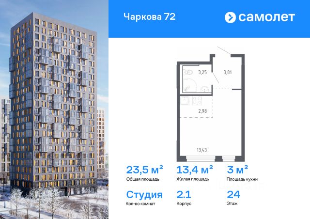 Строим кварталы для жизни с заботой о будущем. Предлагается квартира студия комфорт-класса 23,47 кв.м в корпусе 2.1 на 24 этаже, в ЖК "Чаркова 72" Квартира с чистовой отделкой. Доступность дополнительных опций уточняйте у застройщика. Приобрести квартиру возможно по специальным акциям от застройщика, с текущими условиями акций можно ознакомиться в блоке "Акций". Цена динамическая и может отличаться, уточняйте актуальность у застройщика. Идеальное сочетание городского комфорта и размеренной жизни — квартал "Чаркова 72" на северо-востоке города. В дизайне 17-24-этажных домов с панорамными балконами нашли отражение нотки сибирской природы. От "Чаркова 72" удобно добираться до центра города — всего 17 минут пути. А в 2 минутах от дома находится Тобольский тракт. Для семейного отдыха отлично подойдет парк Гагарина — он находится в 7 минутах от квартала. В закрытых дворах тихо и уютно — все авто остались на одном из 4 многоуровневых паркингов, которые находятся за территорией квартала. Можно спокойно гулять по бульвару и заниматься йогой на спортивной площадке. На первых этажах домов — кафе и магазины. Рядом с проектом — детские сады и школы, городская поликлиника и МФЦ. Во всех квартирах есть выводы под кондиционеры, на подземных этажах — индивидуальные кладовые, на первых — места для хранения велосипедов и колясок. В квартирах можно выбрать варианты отделки: чистовая, черновая и улучшенная из материалов повышенного класса.