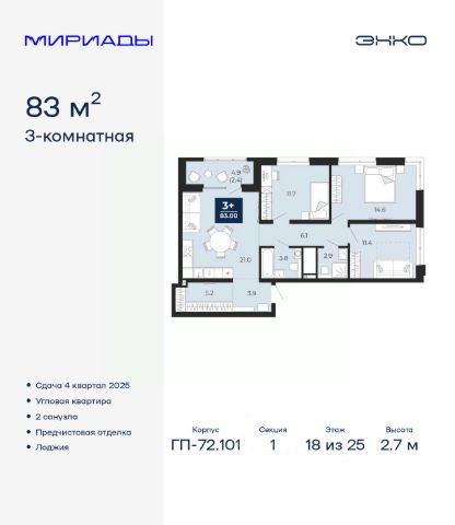 Трехкомнатная квартира от застройщика с предчистовой отделкой в ЖК "Мириады" на 18 этаже. Общая площадь: 83 кв.м., жилая: 37.7 кв.м., площадь просторной кухни-столовой: 21 кв.м. Угловая квартира, очень светлая, естественная вентиляция при открытии окон. В квартире одна лоджия, два совмещенных санузла. Высота потолков 2.7 м. Квартира находится в корпусе ГП-72.101. Дом монолитный, одноподъездный, высотой 25 этажей. На этаже 8 квартир. В подъезде 2 пассажирских и 1 грузовой лифт. Окончание строительства - 4 квартал 2025 года. Оформление сделки по договору долевого участия. Вселенная бесконечных историй. Ранее невиданный Тюмени масштаб: территория 240 гектаров и 1 650 000 м² застройки. Мириады это город масштабных перемен и больших возможностей. Город зеленых рощ и зеркальных озер. Город для работы, учебы и развлечений. Город для детей и их родителей. Город для всех и каждого. Проект расположен в районе Мыс рядом с ТРЦ "Тюмень Сити Молл" в границах улицы Тимофея Чаркова, Тобольского тракта и объездной дороги. Срок полного освоения территории - до 2034 года. #zMTe8l