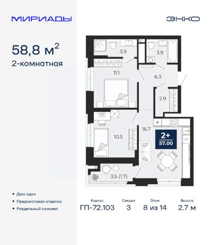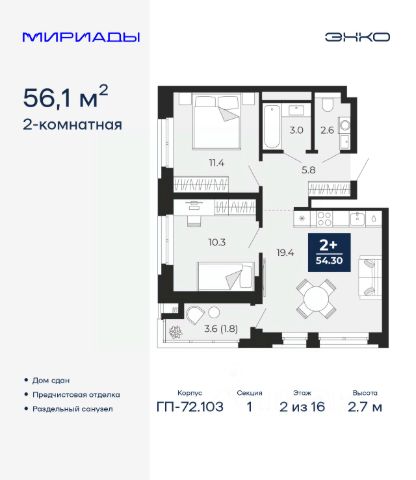 3-комн. квартира от застройщика в ЖК "Беринг" на 2 этаже. Общая площадь: 79.81 кв.м. Высота потолков 2.72 м.