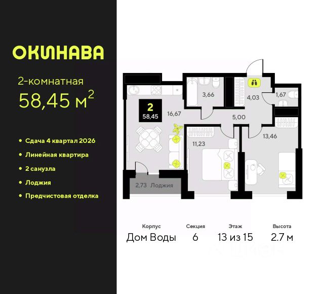 2-комн. квартира от застройщика с предчистовой отделкой в ЖК "Окинава" на 13 этаже. Общая площадь: 58.45 кв.м., жилая: 24.69 кв.м., площадь просторной кухни-столовой: 16.67 кв.м. Комнаты изолированные, все окна выходят на одну сторону. В квартире одна лоджия, один совмещенный и один раздельный санузел. Высота потолков 2.7 м.