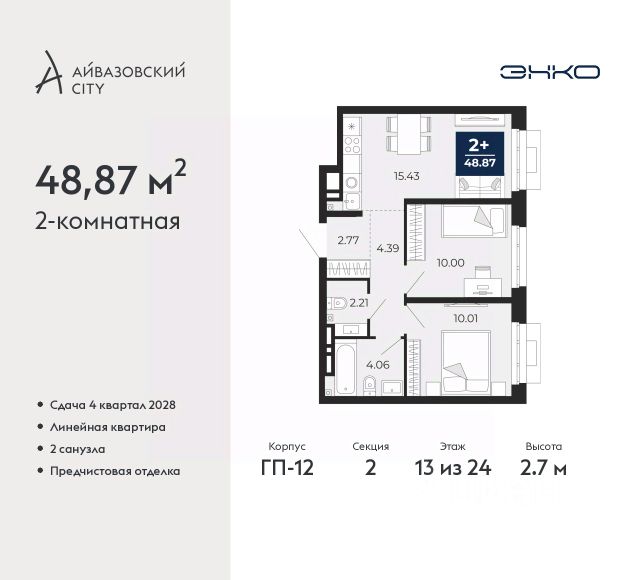 Дом монолитный, многоподъездный, переменной этажности, от 11 до 19 этажей. Квартира находится в 6-й секции высотой 15 этажей в корпусе Дом Воды. На этаже 5 квартир. В подъезде 1 пассажирский и 1 грузовой лифт. Окончание строительства - 4 квартал 2026 года. Оформление сделки по договору долевого участия.