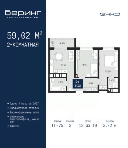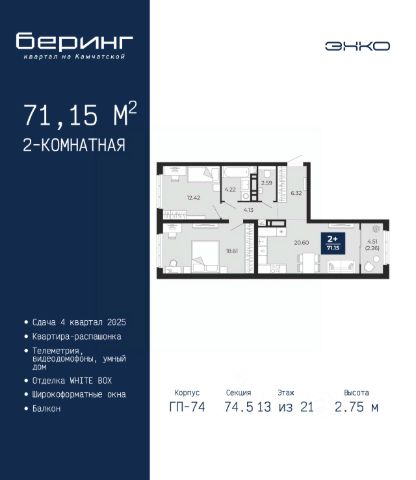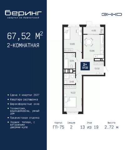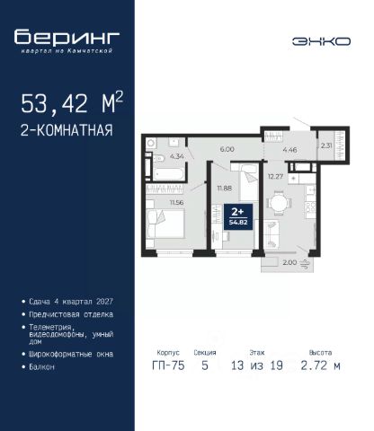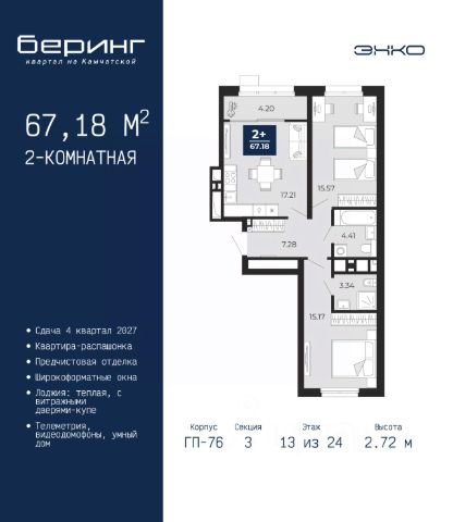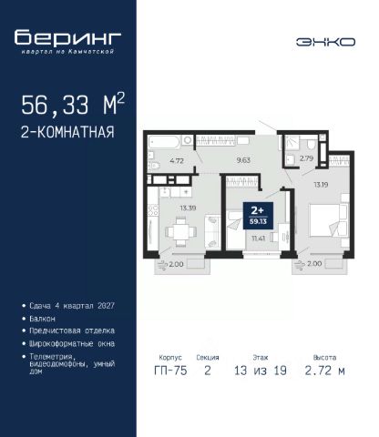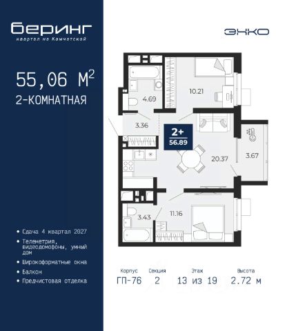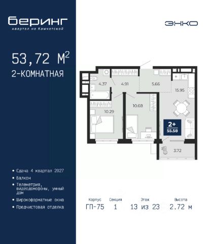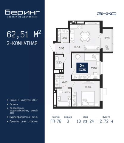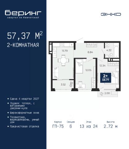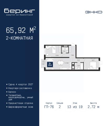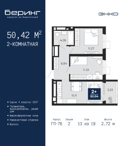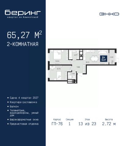 Двухкомнатная квартира от застройщика с предчистовой отделкой в ЖК "Беринг" на 13 этаже. Общая площадь: 50.42 кв.м., жилая: 22.6 кв.м., площадь просторной кухни-столовой: 15.11 кв.м. Комнаты изолированные, все окна выходят на одну сторону. В квартире один балкон, один совмещенный санузел. Высота потолков 2.72 м. Дом монолитный, черырехподъездный, переменной этажности, от 19 до 24 этажей. Квартира находится во 2-й секции высотой 19 этажей в корпусе ГП-76. На этаже 8 квартир. В подъезде 1 пассажирский и 1 грузовой лифт. Окончание строительства - 4 квартал 2027 года. Оформление сделки по договору долевого участия. Подобно знаменитому исследователю, мы чувствуем себя первооткрывателями этой локации. Хотим показать новую суть места, сформировать для вас жизненный опыт, которого ещё не было. Беринг — район зелёного цвета. Беринг — район, который откроется вам с другой стороны. Впечатлит новым уровнем комфорта и качеством жизни. Беринг — открытие на карте города. Первый квартал расположен в районе Тура, в границах улиц: Камчатская Западносибирская Энтузиастов. Вокруг уже есть всё для того, чтобы ежедневная рутина была лишь частью жизни и не доставляла дискомфорта. Школы и детские сады, магазины и аптеки, поликлиника, места для семейного отдыха, пеших и велопрогулок, и даже рыбалки. Масштабное озеленение дворов — визитная карточка ЭНКО и ваш оазис спокойствия, чтобы отвлечься от повседневности. Раскидистые деревья, кустарники, травы и цветы — осталось остановиться, вдохнуть и расслабиться, глядя на эту природную красоту. Стилистика подъездов продолжает концепцию Беринга, вдохновлённого Камчаткой: сдержанный, но при этом впечатляющий дизайн соседствует с удобством и функциональностью. #z6Mcv2