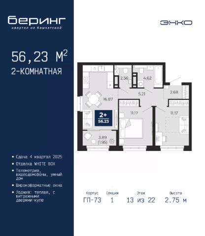 Просторная двухкомнатная квартира с предчистовой отделкой в ЖК "Беринг" на 13 этаже. Общая площадь: 50.42 кв.м., жилая: 22.6 кв.м., площадь просторной кухни-столовой: 15.11 кв.м. Комнаты изолированные, все окна выходят на одну сторону. В квартире один балкон, один совмещенный санузел. Высота потолков 2.72 м. Дом монолитный, черырехподъездный, переменной этажности, от 19 до 24 этажей. Квартира находится во 2-й секции высотой 19 этажей в корпусе ГП-76. На этаже 8 квартир. В подъезде 1 пассажирский и 1 грузовой лифт. Окончание строительства - 4 квартал 2027 года. Оформление сделки по договору долевого участия. Подобно знаменитому исследователю, мы чувствуем себя первооткрывателями этой локации. Хотим показать новую суть места, сформировать для вас жизненный опыт, которого ещё не было. Беринг — район зелёного цвета. Беринг — район, который откроется вам с другой стороны. Впечатлит новым уровнем комфорта и качеством жизни. Беринг — открытие на карте города. Первый квартал расположен в районе Тура, в границах улиц: Камчатская Западносибирская Энтузиастов. Вокруг уже есть всё для того, чтобы ежедневная рутина была лишь частью жизни и не доставляла дискомфорта. Школы и детские сады, магазины и аптеки, поликлиника, места для семейного отдыха, пеших и велопрогулок, и даже рыбалки. Масштабное озеленение дворов — визитная карточка ЭНКО и ваш оазис спокойствия, чтобы отвлечься от повседневности. Раскидистые деревья, кустарники, травы и цветы — осталось остановиться, вдохнуть и расслабиться, глядя на эту природную красоту. Стилистика подъездов продолжает концепцию Беринга, вдохновлённого Камчаткой: сдержанный, но при этом впечатляющий дизайн соседствует с удобством и функциональностью. #z6MCvz