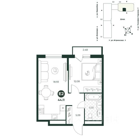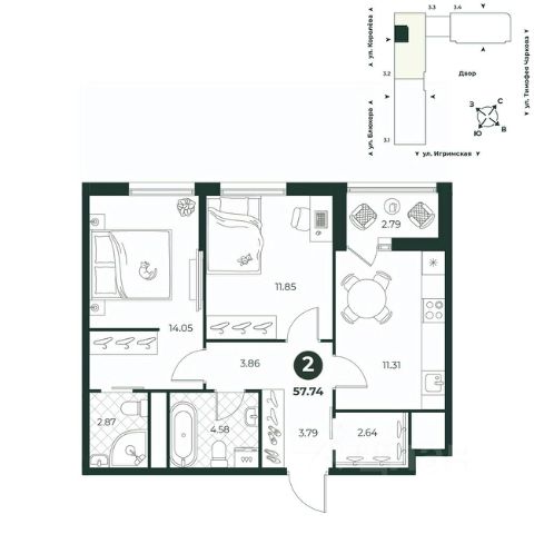 Евродвухкомнатная квартира с просторной кухней-гостиной, для создания комфортной атмосферы совместного времяпрепровождения с семьей. Из комнаты можно выйти на французский балкон с видом на двор. В прихожей есть ниша под шкаф. Площадь санузла подволяет установить стиральную машину.