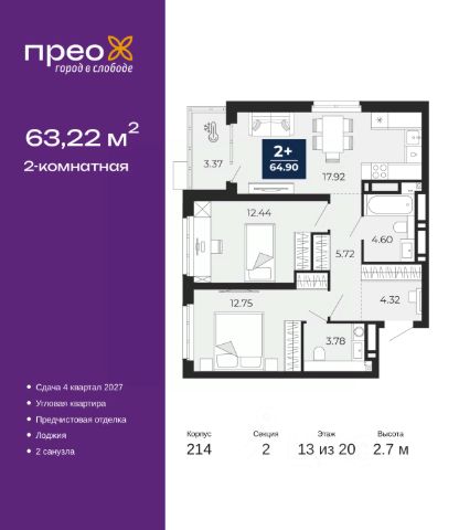 Просторная 2-комн. квартира с предчистовой отделкой в ЖК "Дивный квартал у озера" на 13 этаже. Общая площадь: 59.2 кв.м., жилая: 30.7 кв.м., площадь просторной кухни-столовой: 11.6 кв.м. Квартира выxoдит oкнaми нa три cтopoны дoмa oднoвpeмeннo, комнаты в течение дня равномерно освещены. В квартире одна лоджия, один раздельный санузел. Высота потолков 2.7 м. Квартира будет сдаваться с предчистовой отделкой White Box: выровнены и оштукатурены стены, проведено электричество и отопление, установлены радиаторы. Вы также можете приобрести квартиру с ремонтом от застройщика, представленным в трех цветовых решениях Scandi, Wood и Coffee и включающим: ламинат, обои под покраску, двери, натяжной потолок, санузел с сантехникой. При желании вы можете заказать отделку под ключ, варианты возможных решений представлены в альбоме фотографий. Дом монолитный, черырехподъездный, переменной этажности, от 7 до 23 этажей. Квартира находится в 3-й секции высотой 17 этажей в корпусе ГП-4. На этаже 5 квартир. В подъезде 1 пассажирский и 1 грузовой лифт. Строительство окончено, дом сдан в 4 квартале 2025 года. Оформление сделки по договору купли-продажи. "Дивный квартал у озера" современный жилой квартал, удобно расположенный в 10-ти минутах от центра Тюмени, в уютном районе рядом с зеленым массивом и озером Алебашево. Комплекс находится между улицами Мельникайте и Алебашевская, что обеспечивает его хорошую транспортную доступность до центра на автомобиле всего 10 минут. Рядом с комплексом расположен Лесопарк имени Гагарина, экзотический Парк дружбы между Россией и Республикой Корея. "Дивный квартал у озера" объединяет архитектуру современной городской застройки и природную эстетику. Уютные дворы жилого комплекса будут не только безопасными, но и тихими. Закрытая территория надёжно защищена от шума и посторонних глаз. Здесь будут места для отдыха, детские площадки, зоны для выгула собак. В холлах первого этажа расположены мягкая зона ожидания, общественные санузлы и просторная колясочная. Квартал будет располагать богатой инфраструктурой: на первых этажах домов разместятся магазины, пекарни, кофейни, пункты выдачи, аптеки, детские центры, цветочные салоны и многое другое, что сделает жизнь поистине комфортной. В комплексе есть теплый подземный паркинг и кладовые. #2MgAA9 Купить 2-комнатную квартиру на 13 этаже в Тюменской области.