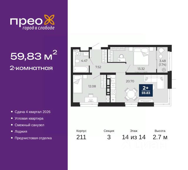 Просторная 2-комн. квартира в ЖК "Мидгард на Уездной" на 14 этаже. Квартира без отделки, после оформления собственности можно делать ремонт. Общая площадь: 59.35 кв.м., жилая: 22.15 кв.м., площадь просторной кухни-столовой: 21.68 кв.м. Комнаты изолированные, все окна выходят на одну сторону. В квартире одна лоджия, два совмещенных санузла. Высота потолков 2.72 м. Дом монолитный, черырехподъездный, переменной этажности, от 9 до 15 этажей. Квартира находится в 4-й секции высотой 15 этажей в корпусе ГП-1. На этаже 9 квартир. В подъезде 1 пассажирский и 1 грузовой лифт. Окончание строительства - 3 квартал 2027 года. Оформление сделки по договору долевого участия. "Мидгард на Уездной" - современный проект комфорт-класса, расположенный на первой линии Тюменской слободы, с видом на развязку Московского тракта. Он сочетает в себе современные архитектурные решения и комфортное проживание в гармонии с природой. Жилой комплекс находится в перспективном районе, который отличается транспортной доступностью: до крупных торговых центров "Кристалл" и "Колумб" можно добраться за 10 минут, а до центра города - за 15 минут. В шаговой доступности школы, детские сады, торговые центры и парки, что делает локацию идеальной для комфортной жизни. Проектом предусмотрены дома с дизайнерскими входными зонами и планировочными решения для любого сценария жизни с возможностью включить в ипотечный платеж ремонт, мебель и технику от застройщика. Закрытый двор и собственная аллея вдоль жилого комплекса позволят насладиться тишиной вдали от суеты большого города. #Z6sds8