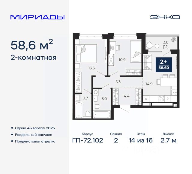 Продается шикарная квартира с двумя спальнями в квартале "Новин". Высота потолков 2.74 метра. Дом сдан! Окна выходят на две стороны. Очень солнечная квартира. Два зенитных окна - в спальне и в кухне. Проект "Новин" разработан совместно с международным архитектурным бюро ahr (они проектировали небоскребы в Дубае, аэропорт в Гонконге, участвовали в реконструкции морского порта в Сочи и штаб-квартиры кинокомпании Lucasfilm). Особенность комплекса: закрытый двор без машин, комплексная система видеонаблюдения и круглосуточная охрана, прозрачные двери подъезда, домофон внутри подъезда, парковки по внешнему периметру двора, подземный теплый паркинг (прямо с уровня паркинга работают лифты), во дворе вместо асфальта уложена брусчатка, установлено спортивное и игровое оборудование, есть велодорожки и зоны отдыха. Квартал расположен на пересечении улиц 50 лет Октября и Одесской, отсюда легко добраться до любого района Тюмени. В шаговой доступности — школы 7,20 гимназии 12, 16, университеты - Тюменский государственный университет (Тюмгу), Тюменский индустриальный университет (туи), детские сады 58, 90, 100, 101, Областная клиническая больница 2, Гипермаркет Магнит, супермаркеты и аптеки, рестораны и салоны красоты, шиномонтаж и автомойки. Особенности жилья: вход в подьезд на уровне земли, без ступеней, в квартирах видеодомофоны, на первых этажах расположены помещения для колясок и велосипедов, понятная навигация поможет гостям пройти до квартиры, в квартирах выделены зоны под гардеробные комнаты, либо зоны под установки шкафов-купе, лоджии остеклены, остекление окон пятикамерным пластиковым стеклопакетом, хорошо защищающий от внешнего шума и сохраняющий тепло, установлены финские радиаторы отопления с терморегуляторами, автоматическая телеметрия всех показаний на индивидуальные счетчики, тепла, воды, электричества и передача данных напрямую в управляющую компанию, так же на балконах установлена дренажная трасса для подключения кондиционера, установлена противопожарная сигнализация. Квартиры продаются в улучшенной черновой отделке.