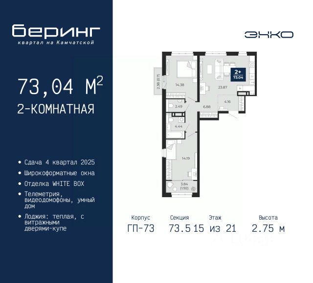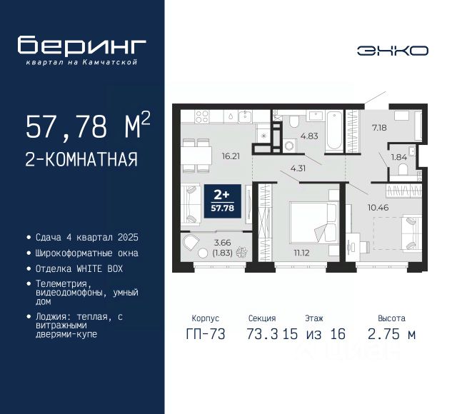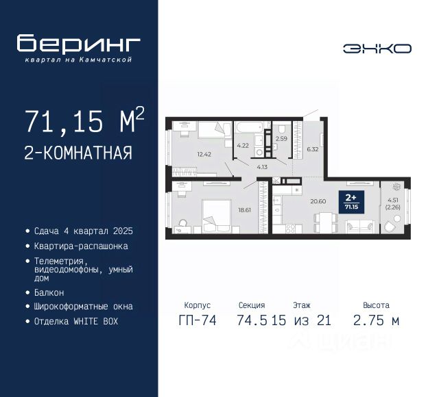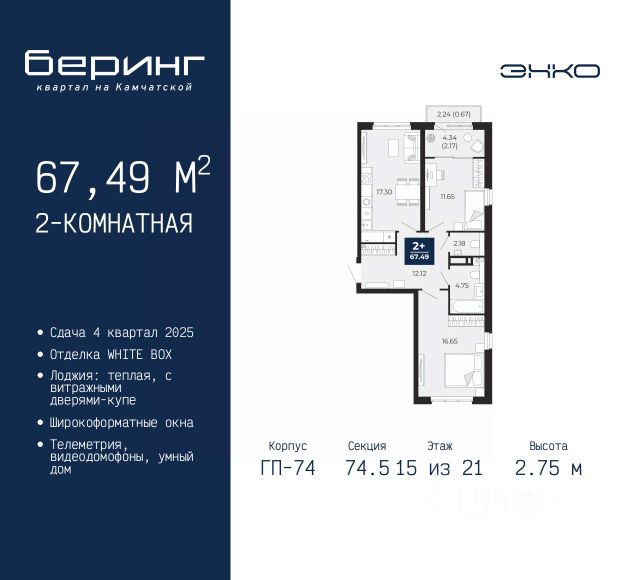 Двухкомнатная квартира в ЖК "Беринг" на 15 этаже. Квартира без отделки, после выдачи ключей можно делать ремонт. Общая площадь: 48.48 кв.м., жилая: 22.47 кв.м., площадь просторной кухни-столовой: 11.67 кв.м. Квартира угловая, идеально подойдет любителям тишины и панорамных видов. В квартире одна лоджия, один совмещенный санузел. Высота потолков 2.75 м. Дом монолитный, многоподъездный, переменной этажности, от 9 до 21 этажей. Квартира находится во 2-й секции высотой 17 этажей в корпусе ГП-74. На этаже 7 квартир. В подъезде 1 пассажирский и 1 грузовой лифт. Окончание строительства - 4 квартал 2025 года. Оформление сделки по договору долевого участия. Подобно знаменитому исследователю, мы чувствуем себя первооткрывателями этой локации. Хотим показать новую суть места, сформировать для вас жизненный опыт, которого ещё не было. Беринг — район зелёного цвета. Беринг — район, который откроется вам с другой стороны. Впечатлит новым уровнем комфорта и качеством жизни. Беринг — открытие на карте города. Первый квартал расположен в районе Тура, в границах улиц: Камчатская Западносибирская Энтузиастов. Вокруг уже есть всё для того, чтобы ежедневная рутина была лишь частью жизни и не доставляла дискомфорта. Школы и детские сады, магазины и аптеки, поликлиника, места для семейного отдыха, пеших и велопрогулок, и даже рыбалки. Масштабное озеленение дворов — визитная карточка ЭНКО и ваш оазис спокойствия, чтобы отвлечься от повседневности. Раскидистые деревья, кустарники, травы и цветы — осталось остановиться, вдохнуть и расслабиться, глядя на эту природную красоту. Стилистика подъездов продолжает концепцию Беринга, вдохновлённого Камчаткой: сдержанный, но при этом впечатляющий дизайн соседствует с удобством и функциональностью. #zu5Mms