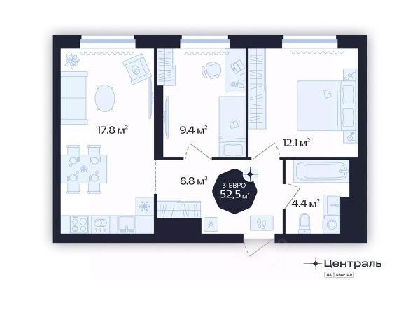 Квартира с кухней-гостиной и двумя спальнями в кварталах "На Минской". Особенности планировки: гардеробная, разнесённые спальни, предчистовая отделка, мастер-спальня, балкон.