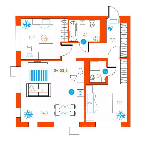 2-комн. квартира от застройщика с предчистовой отделкой в ЖК "Республики 205" на 15 этаже. Общая площадь: 60.21 кв.м., жилая: 24 кв.м., площадь просторной кухни-гостиной: 17.9 кв.м. Комнаты изолированные, все окна выходят на одну сторону. В квартире одна лоджия, один совмещенный и один раздельный санузел. Высота потолков 2.6 м.