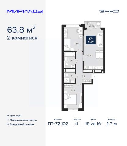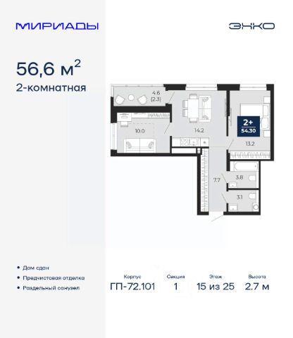 Торопитесь оформить бронирование по акционной цене, предложение ограничено! Стоимость квартиры указана со скидкой, ваша экономия составит 428,733 руб. Звоните, наши менеджеры вам все расскажут. 2-комн. квартира с предчистовой отделкой в ЖК "Мириады" на 15 этаже. Общая площадь: 57.9 кв.м., жилая: 25.7 кв.м., площадь просторной кухни-столовой: 15.2 кв.м. Комнаты изолированные, все окна выходят на одну сторону. В квартире одна лоджия, два совмещенных санузла. Высота потолков 2.7 м. Дом монолитный, многоподъездный, переменной этажности, от 14 до 16 этажей. Квартира находится в 4-й секции высотой 16 этажей в корпусе ГП-72.102. На этаже 6 квартир. В подъезде 1 пассажирский и 1 грузовой лифт. В настоящее время строительство завершено, дом сдан в 4 квартале 2025 года. Оформление сделки по договору купли-продажи. Вселенная бесконечных историй. Ранее невиданный Тюмени масштаб: территория 240 гектаров и 1 650 000 м² застройки. Мириады это город масштабных перемен и больших возможностей. Город зеленых рощ и зеркальных озер. Город для работы, учебы и развлечений. Город для детей и их родителей. Город для всех и каждого. Проект расположен в районе Мыс рядом с ТРЦ "Тюмень Сити Молл" в границах улицы Тимофея Чаркова, Тобольского тракта и объездной дороги. Срок полного освоения территории - до 2034 года. #z67ESA