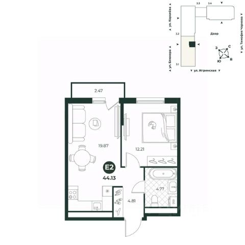 Евродвухкомнатная квартира с выходом на французский балкон из спальни. Просторная кухня-гостиная идеально подходит для размещения семейного обеденного стола и детской игровой зоны. В прихожей достаточно места для расположения шкафа. Санузел совмещенный. Окна выходят во двор.