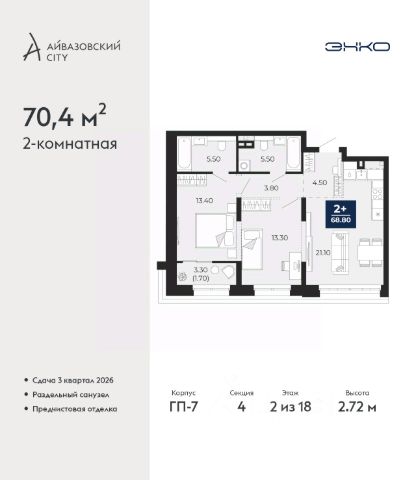 Двухкомнатная квартира от застройщика с предчистовой отделкой в ЖК "Айвазовский" на 2 этаже. Общая площадь: 70.4 кв.м. Высота потолков 2.72 м. Дом монолитный, многоподъездный, переменной этажности, от 9 до 24 этажей. Квартира находится в 4-й секции высотой 18 этажей в корпусе ГП-7. На этаже 5 квартир. В подъезде 1 пассажирский и 2 грузовых лифта. Окончание строительства - 3 квартал 2026 года. Оформление сделки по договору долевого участия. Новый жилой район располагается в живописном месте на берегу Туры в центральной части города. Принципиально новое пространство для жизни в центре современного города для тех, чьи мечты сбываются, кто нацелен на постоянный рост, перемены к лучшему для себя и своих близких. Каждая деталь ЖК "Айвазовский" вдохновляет и заряжает на новые свершения: авторская архитектура, сбалансированная продуманная инфраструктура, дизайнерские дворы со спортивными и детскими площадками, парковые зоны с фонтанами, водный канал, украшающий центральный прогулочный маршрут района и многое другое. В 2019 года проект стал лауреатом престижной премии Urban Awards 2019 в номинации "Лучший строящийся региональный жилой комплекс бизнес-класса". Главная особенность Айвазовский - соседство разных архитектурных школ в рамках одного дома. Изысканная классика, выразительная эклектика и оригинальный модерн - жить в одном из таких домов настоящий повод для гордости. Айвазовский это идеальное сочетание комфорта, технологий и развитой инфраструктуры. Вход в подъезд возможен с улицы и со двора. Отправляясь на работу или за покупками, жители могут выйти с внешней стороны дома, а для прогулки с ребенком со стороны двора. Экологически чистые материалы и энергосберегающие технологии, качественное освещение общественных зон, видеонаблюдение по всей территории жилого района (в том числе в подъездах, лифтах и в подземном паркинге), закрытые дворы с доступом только для жителей Айвазовский. Часть домов в Айвазовский будут оснащены подземным паркингом. Востребованный в нашем климатическом поясе формат хранения автомобилей защитит собственность владельца в любое время года. Аккредитация в банках: "Сбербанк России", ПАО Банк "ВТБ", ПАО "Газпромбанк", ОАО "Альфа-Банк", ПАО "Промсвязьбанк" и других. #z6EiTm