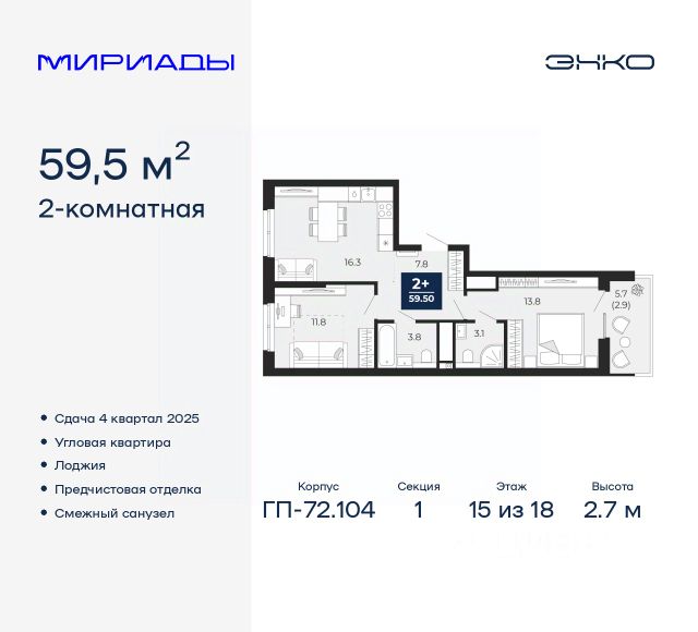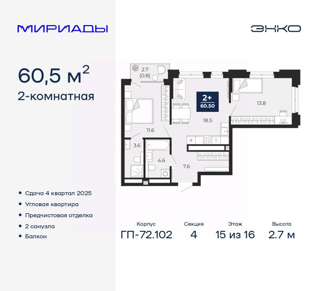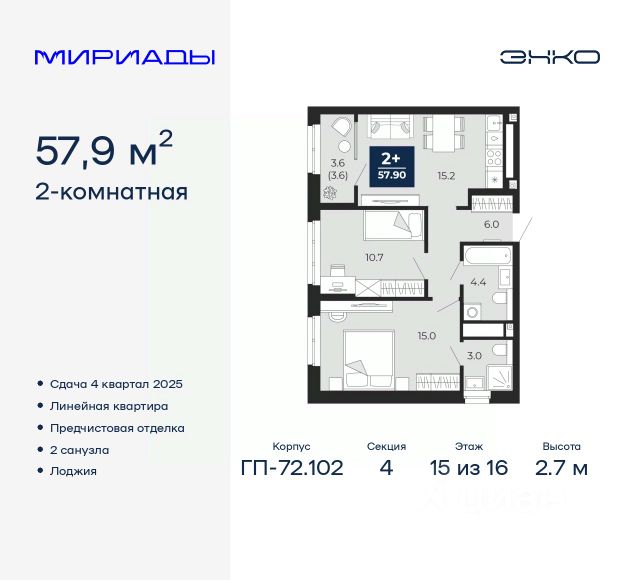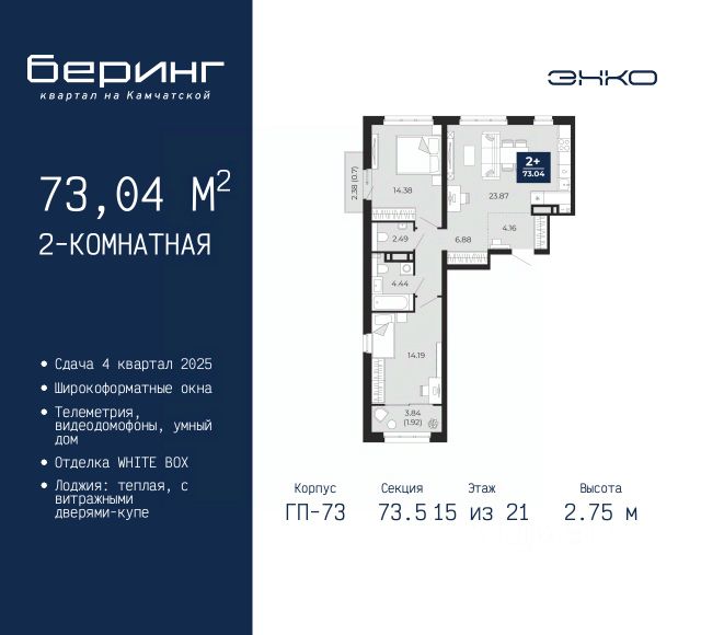 Двухкомнатная квартира в ЖК "Беринг" на 15 этаже. Квартира без отделки, после оформления собственности можно делать ремонт. Общая площадь: 73.04 кв.м., жилая: 28.57 кв.м., площадь просторной кухни-столовой: 23.87 кв.м. Квартира без проходных комнат, окна выходят нa три cтopoны дома. В квартире один балкон и одна лоджия, один совмещенный и один раздельный санузел. Высота потолков 2.75 м. Дом монолитный, многоподъездный, переменной этажности, от 9 до 22 этажей. Квартира находится в 73.5-й секции высотой 21 этаж в корпусе ГП-73. На этаже 6 квартир. В подъезде 1 пассажирский и 1 грузовой лифт. Окончание строительства - 4 квартал 2025 года. Оформление сделки по договору долевого участия. Подобно знаменитому исследователю, мы чувствуем себя первооткрывателями этой локации. Хотим показать новую суть места, сформировать для вас жизненный опыт, которого ещё не было. Беринг — район зелёного цвета. Беринг — район, который откроется вам с другой стороны. Впечатлит новым уровнем комфорта и качеством жизни. Беринг — открытие на карте города. Первый квартал расположен в районе Тура, в границах улиц: Камчатская Западносибирская Энтузиастов. Вокруг уже есть всё для того, чтобы ежедневная рутина была лишь частью жизни и не доставляла дискомфорта. Школы и детские сады, магазины и аптеки, поликлиника, места для семейного отдыха, пеших и велопрогулок, и даже рыбалки. Масштабное озеленение дворов — визитная карточка ЭНКО и ваш оазис спокойствия, чтобы отвлечься от повседневности. Раскидистые деревья, кустарники, травы и цветы — осталось остановиться, вдохнуть и расслабиться, глядя на эту природную красоту. Стилистика подъездов продолжает концепцию Беринга, вдохновлённого Камчаткой: сдержанный, но при этом впечатляющий дизайн соседствует с удобством и функциональностью. #Z3S7Dl