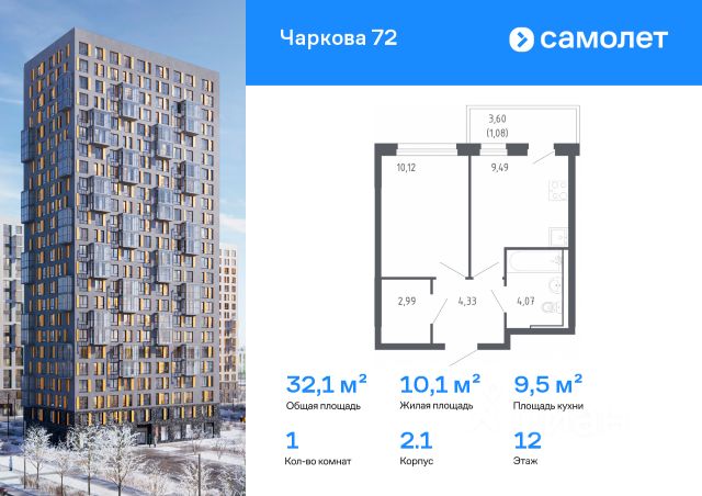 Строим кварталы для жизни с заботой о будущем. Предлагается 1-комнатная квартира комфорт-класса 32,08 кв.м в корпусе 2.1 на 12 этаже, в ЖК "Чаркова 72" Квартира с чистовой отделкой. Доступность дополнительных опций уточняйте у застройщика. Приобрести квартиру возможно по специальным акциям от застройщика, с текущими условиями акций можно ознакомиться в блоке "Акций". Цена динамическая и может отличаться, уточняйте актуальность у застройщика. Идеальное сочетание городского комфорта и размеренной жизни — квартал "Чаркова 72" на северо-востоке города. В дизайне 17-24-этажных домов с панорамными балконами нашли отражение нотки сибирской природы. От "Чаркова 72" удобно добираться до центра города — всего 17 минут пути. А в 2 минутах от дома находится Тобольский тракт. Для семейного отдыха отлично подойдет парк Гагарина — он находится в 7 минутах от квартала. В закрытых дворах тихо и уютно — все авто остались на одном из 4 многоуровневых паркингов, которые находятся за территорией квартала. Можно спокойно гулять по бульвару и заниматься йогой на спортивной площадке. На первых этажах домов — кафе и магазины. Рядом с проектом — детские сады и школы, городская поликлиника и МФЦ. Во всех квартирах есть выводы под кондиционеры, на подземных этажах — индивидуальные кладовые, на первых — места для хранения велосипедов и колясок. В квартирах можно выбрать варианты отделки: чистовая, черновая и улучшенная из материалов повышенного класса.