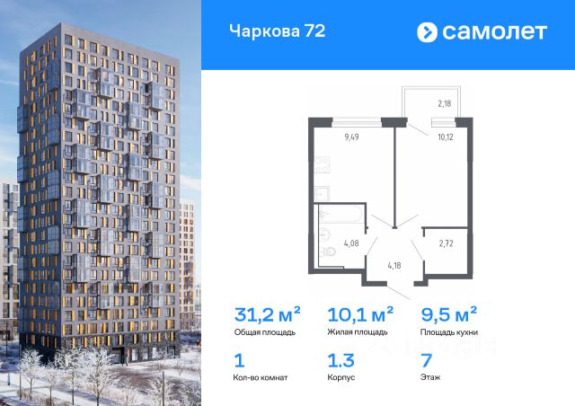 Строим кварталы для жизни с заботой о будущем. Предлагается 1-комнатная квартира комфорт-класса 31,24 кв.м в корпусе 1.3 на 7 этаже, в ЖК "Чаркова 72" Квартира с предчистовой отделкой. Доступность дополнительных опций уточняйте у застройщика. Приобрести квартиру возможно по специальным акциям от застройщика, с текущими условиями акций можно ознакомиться в блоке "Акций". Цена динамическая и может отличаться, уточняйте актуальность у застройщика. Идеальное сочетание городского комфорта и размеренной жизни — квартал "Чаркова 72" на северо-востоке города. В дизайне 17-24-этажных домов с панорамными балконами нашли отражение нотки сибирской природы. От "Чаркова 72" удобно добираться до центра города — всего 17 минут пути. А в 2 минутах от дома находится Тобольский тракт. Для семейного отдыха отлично подойдет парк Гагарина — он находится в 7 минутах от квартала. В закрытых дворах тихо и уютно — все авто остались на одном из 4 многоуровневых паркингов, которые находятся за территорией квартала. Можно спокойно гулять по бульвару и заниматься йогой на спортивной площадке. На первых этажах домов — кафе и магазины. Рядом с проектом — детские сады и школы, городская поликлиника и МФЦ. Во всех квартирах есть выводы под кондиционеры, на подземных этажах — индивидуальные кладовые, на первых — места для хранения велосипедов и колясок. В квартирах можно выбрать варианты отделки: чистовая, черновая и улучшенная из материалов повышенного класса.