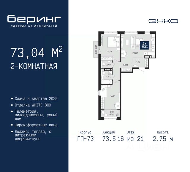 Продается 2-комн. квартира в ЖК "Беринг" на 16 этаже. Квартира без отделки, после оформления собственности можно делать ремонт. Общая площадь: 57.37 кв.м., жилая: 22.92 кв.м., площадь просторной кухни-столовой: 14.56 кв.м. Квартира - распашонка, без проходных комнат, окна выходят на paзные стороны дома. В квартире один балкон, один совмещенный и один раздельный санузел. Высота потолков 2.75 м. Дом монолитный, многоподъездный, переменной этажности, от 9 до 21 этажей. Квартира находится во 2-й секции высотой 17 этажей в корпусе ГП-74. На этаже 7 квартир. В подъезде 1 пассажирский и 1 грузовой лифт. Окончание строительства - 4 квартал 2025 года. Оформление сделки по договору долевого участия. Подобно знаменитому исследователю, мы чувствуем себя первооткрывателями этой локации. Хотим показать новую суть места, сформировать для вас жизненный опыт, которого ещё не было. Беринг — район зелёного цвета. Беринг — район, который откроется вам с другой стороны. Впечатлит новым уровнем комфорта и качеством жизни. Беринг — открытие на карте города. Первый квартал расположен в районе Тура, в границах улиц: Камчатская Западносибирская Энтузиастов. Вокруг уже есть всё для того, чтобы ежедневная рутина была лишь частью жизни и не доставляла дискомфорта. Школы и детские сады, магазины и аптеки, поликлиника, места для семейного отдыха, пеших и велопрогулок, и даже рыбалки. Масштабное озеленение дворов — визитная карточка ЭНКО и ваш оазис спокойствия, чтобы отвлечься от повседневности. Раскидистые деревья, кустарники, травы и цветы — осталось остановиться, вдохнуть и расслабиться, глядя на эту природную красоту. Стилистика подъездов продолжает концепцию Беринга, вдохновлённого Камчаткой: сдержанный, но при этом впечатляющий дизайн соседствует с удобством и функциональностью. #z3SMff