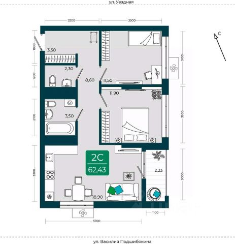 Квартира с кухней-гостиной и двумя спальнями в Октябрьском на Туре. Особенности планировки: балкон, вид во двор, второй санузел, предчистовая отделка, тёплая лоджия. квартиры в нашей базе: КО-07.1-2-2.16.2. Район Проект расположен на берегу реки, в одном из самых живописных и экологичных районов Тюмени. За последние годы облик района изменился. По соседству с индивидуальной застройкой выросли многоквартирные дома. При проектировании "Октябрьского на Туре" нашей приоритетной задачей стало сохранение природного ландшафта: мы постарались деликатно вписать в него современную архитектуру. Квартал удачно расположен с точки зрения дорожной инфраструктуры. На автомобиле путь до центра города составит 15 минут. Добраться до набережной и главных тюменских достопримечательностей можно и на общественном транспорте. В пешей доступности находится автобусная остановка. Проект По мастер-плану здесь будет восемь домов. Ядро застройки составляют замкнутые кварталы переменной этажности. Их высотность понижается по мере приближения к реке. На углах участка мы разместили башни-доминанты. Одной из достопримечательностей квартала станет парк на Туре — здесь появится зеленая зона протяженностью около 6 километров для пеших и велопрогулок. Смысловая ось квартала — широкая главная улица с высаженными вдоль неё высокими деревьями. Они создают тень и работают как шумо- и пылезащитные экраны. Это место сосредоточения основных пешеходных и транспортных потоков, на сторону которых мы ориентировали большинство коммерческих помещений. Отсюда жители могут свернуть на тихие соседские улицы и попасть на внутриквартальную площадь — ещё одну точку притяжения.