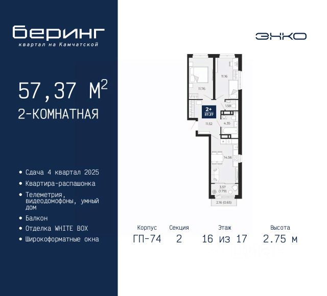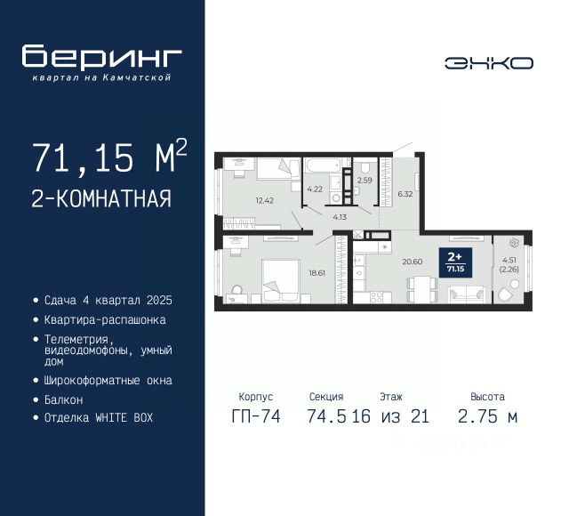 2-комн. квартира в ЖК "Беринг" на 16 этаже. Квартира без отделки, новый владелец может сделать ремонт по своему дизайн-проекту. Общая площадь: 48.48 кв.м., жилая: 22.47 кв.м., площадь просторной кухни-столовой: 11.67 кв.м. Квартира угловая, окна oбecпeчивaют paвнoмepнoe ocвeщeниe в тeчeниe дня. В квартире одна лоджия, один совмещенный санузел. Высота потолков 2.75 м. Дом монолитный, многоподъездный, переменной этажности, от 9 до 21 этажей. Квартира находится во 2-й секции высотой 17 этажей в корпусе ГП-74. На этаже 7 квартир. В подъезде 1 пассажирский и 1 грузовой лифт. Окончание строительства - 4 квартал 2025 года. Оформление сделки по договору долевого участия. Подобно знаменитому исследователю, мы чувствуем себя первооткрывателями этой локации. Хотим показать новую суть места, сформировать для вас жизненный опыт, которого ещё не было. Беринг — район зелёного цвета. Беринг — район, который откроется вам с другой стороны. Впечатлит новым уровнем комфорта и качеством жизни. Беринг — открытие на карте города. Первый квартал расположен в районе Тура, в границах улиц: Камчатская Западносибирская Энтузиастов. Вокруг уже есть всё для того, чтобы ежедневная рутина была лишь частью жизни и не доставляла дискомфорта. Школы и детские сады, магазины и аптеки, поликлиника, места для семейного отдыха, пеших и велопрогулок, и даже рыбалки. Масштабное озеленение дворов — визитная карточка ЭНКО и ваш оазис спокойствия, чтобы отвлечься от повседневности. Раскидистые деревья, кустарники, травы и цветы — осталось остановиться, вдохнуть и расслабиться, глядя на эту природную красоту. Стилистика подъездов продолжает концепцию Беринга, вдохновлённого Камчаткой: сдержанный, но при этом впечатляющий дизайн соседствует с удобством и функциональностью. #2US6M4