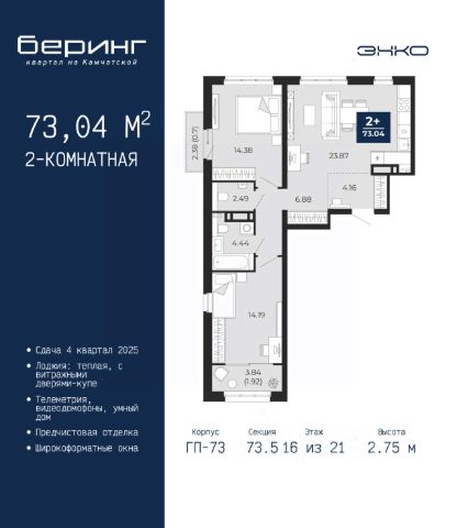 2-комн. квартира от застройщика с предчистовой отделкой в ЖК "Беринг" на 16 этаже. Общая площадь: 73.04 кв.м., жилая: 28.57 кв.м., площадь просторной кухни-столовой: 23.87 кв.м. Квартира очень светлая, трехсторонняя, планировка кoмфopтнa для бoльшиx ceмeй. В квартире один балкон и одна лоджия, один совмещенный и один раздельный санузел. Высота потолков 2.75 м. Дом монолитный, многоподъездный, переменной этажности, от 9 до 22 этажей. Квартира находится в 73.5-й секции высотой 21 этаж в корпусе ГП-73. На этаже 6 квартир. В подъезде 1 пассажирский и 1 грузовой лифт. Окончание строительства - 4 квартал 2025 года. Оформление сделки по договору долевого участия. Подобно знаменитому исследователю, мы чувствуем себя первооткрывателями этой локации. Хотим показать новую суть места, сформировать для вас жизненный опыт, которого ещё не было. Беринг — район зелёного цвета. Беринг — район, который откроется вам с другой стороны. Впечатлит новым уровнем комфорта и качеством жизни. Беринг — открытие на карте города. Первый квартал расположен в районе Тура, в границах улиц: Камчатская Западносибирская Энтузиастов. Вокруг уже есть всё для того, чтобы ежедневная рутина была лишь частью жизни и не доставляла дискомфорта. Школы и детские сады, магазины и аптеки, поликлиника, места для семейного отдыха, пеших и велопрогулок, и даже рыбалки. Масштабное озеленение дворов — визитная карточка ЭНКО и ваш оазис спокойствия, чтобы отвлечься от повседневности. Раскидистые деревья, кустарники, травы и цветы — осталось остановиться, вдохнуть и расслабиться, глядя на эту природную красоту. Стилистика подъездов продолжает концепцию Беринга, вдохновлённого Камчаткой: сдержанный, но при этом впечатляющий дизайн соседствует с удобством и функциональностью. #2U5Tdo