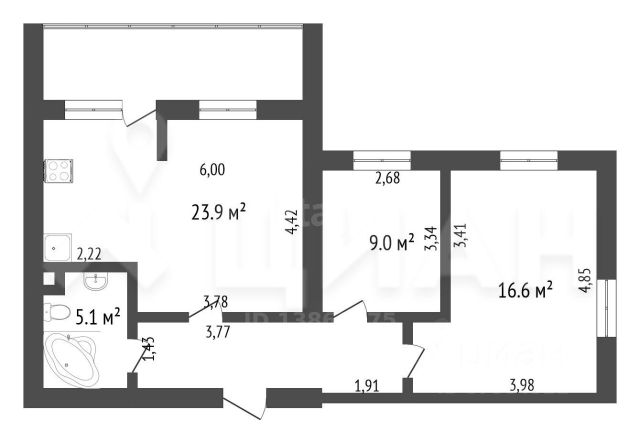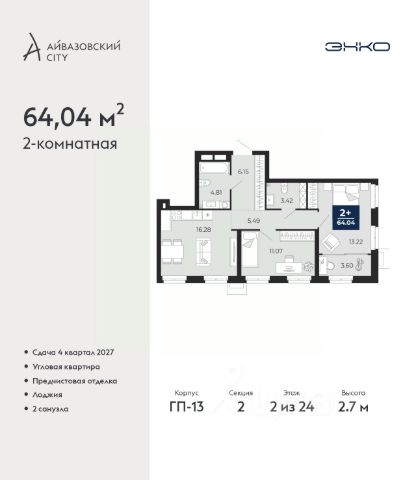 2-комн. квартира от застройщика в ЖК "Айвазовский" на 2 этаже. Квартира без отделки, новый владелец может сделать ремонт по своему дизайн-проекту. Общая площадь: 90.06 кв.м., жилая: 42.88 кв.м., площадь просторной кухни-столовой: 23.18 кв.м. Квартира угловая, идеально подойдет любителям тишины и панорамных видов. В квартире одна лоджия, два совмещенных санузла. Высота потолков 2.72 м.