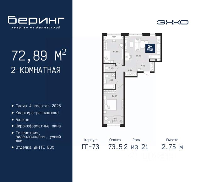 Просторная 2-комн. квартира в ЖК "Беринг" на 2 этаже. Квартира без отделки, новый владелец может сделать ремонт по индивидуальному дизайн-проекту. Общая площадь: 58.97 кв.м., жилая: 23.58 кв.м., площадь просторной кухни-столовой: 17.86 кв.м. Квартира угловая, идеально подойдет любителям тишины и панорамных видов. В квартире одна лоджия, один совмещенный и один раздельный санузел. Высота потолков 2.75 м. Дом монолитный, многоподъездный, переменной этажности, от 9 до 22 этажей. Квартира находится в 73.6-й секции высотой 9 этажей в корпусе ГП-73. На этаже 5 квартир. В подъезде 1 пассажирский и 1 грузовой лифт. Окончание строительства - 4 квартал 2025 года. Оформление сделки по договору долевого участия. Подобно знаменитому исследователю, мы чувствуем себя первооткрывателями этой локации. Хотим показать новую суть места, сформировать для вас жизненный опыт, которого ещё не было. Беринг — район зелёного цвета. Беринг — район, который откроется вам с другой стороны. Впечатлит новым уровнем комфорта и качеством жизни. Беринг — открытие на карте города. Первый квартал расположен в районе Тура, в границах улиц: Камчатская Западносибирская Энтузиастов. Вокруг уже есть всё для того, чтобы ежедневная рутина была лишь частью жизни и не доставляла дискомфорта. Школы и детские сады, магазины и аптеки, поликлиника, места для семейного отдыха, пеших и велопрогулок, и даже рыбалки. Масштабное озеленение дворов — визитная карточка ЭНКО и ваш оазис спокойствия, чтобы отвлечься от повседневности. Раскидистые деревья, кустарники, травы и цветы — осталось остановиться, вдохнуть и расслабиться, глядя на эту природную красоту. Стилистика подъездов продолжает концепцию Беринга, вдохновлённого Камчаткой: сдержанный, но при этом впечатляющий дизайн соседствует с удобством и функциональностью. #2U5T08