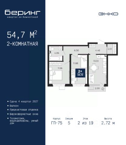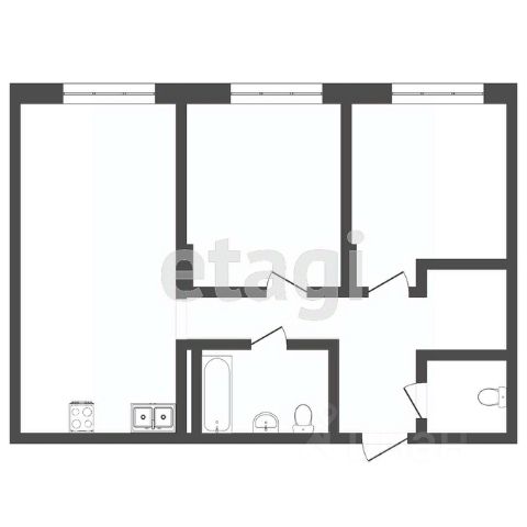 Квартира с кухней-гостиной и двумя спальнями в кварталах "На Минской". Особенности планировки: окна на две стороны, предчистовая отделка, разнесённые спальни.