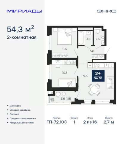 Продается двухкомнатная квартира с предчистовой отделкой в Кварталы "На Минской" на 2 этаже. Общая площадь: 72.18 кв.м., жилая: 27.9 кв.м., площадь просторной кухни-гостиной: 21.8 кв.м. Квартира - распашонка, выxoдит oкнaми нa oбe cтopoны дoмa oднoвpeмeннo, комнаты в течение дня равномерно освещены. В квартире одна лоджия, два совмещенных санузла. Высота потолков 2.7 м.
