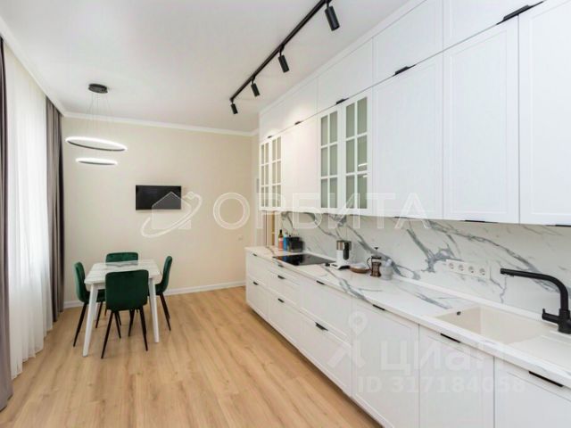Просторная кухня-гостиная уже укомплектована на 100%. Кухонный гарнитур с полным комплектом встроенной техники - холодильник, посудомоечная машина, духовой шкаф, микроволновка, варочная поверхность и вытяжка, красивый обеденный стол с мягкими стульями, стильный диван и тв-тумба.