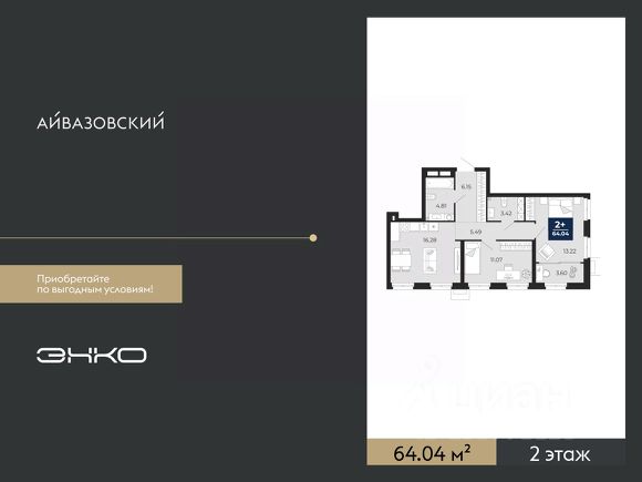 Двухкомнатная квартира от застройщика с предчистовой отделкой в ЖК "Айвазовский" на 2 этаже. Общая площадь: 64.04 кв.м., жилая: 24.29 кв.м., площадь просторной кухни-столовой: 16.28 кв.м. Угловая квартира, идеально подойдет любителям тишины и панорамных видов. В квартире одна лоджия, один совмещенный и один раздельный санузел. Высота потолков 2.7 м.