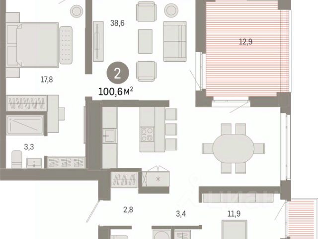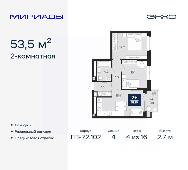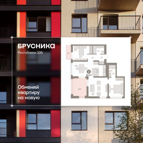 2-комн. квартира с предчистовой отделкой в ЖК "Республики 205" на 4 этаже. Общая площадь: 72.07 кв.м., жилая: 19.1 кв.м., площадь просторной кухни-гостиной: 28.6 кв.м. Квартира угловая, очень светлая, естественная вентиляция при открытии окон. В квартире один балкон, один совмещенный санузел. Высота потолков 2.7 м.