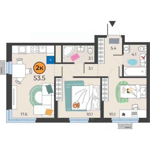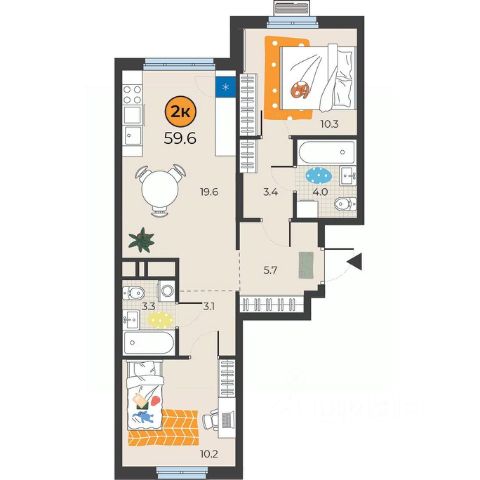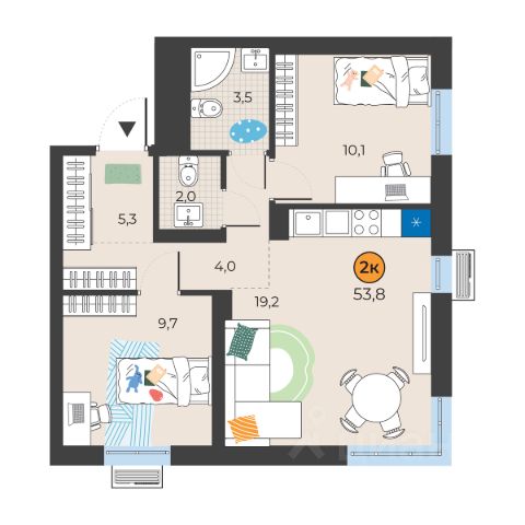 В квартире очень удобная и многофункциональная планировка: большая кухня (9.4 м²), две комнаты правильной прямоугольной формы, где достаточно места для организации как зоны отдыха, так и рабочего пространства, раздельный санузел и лоджия.